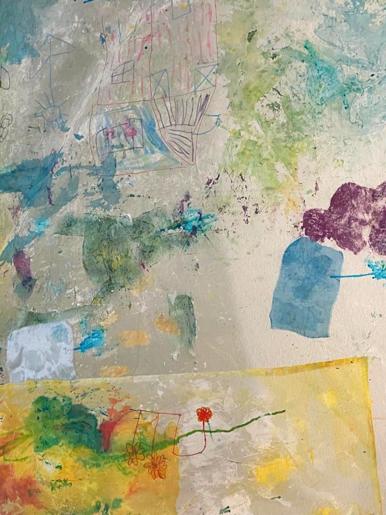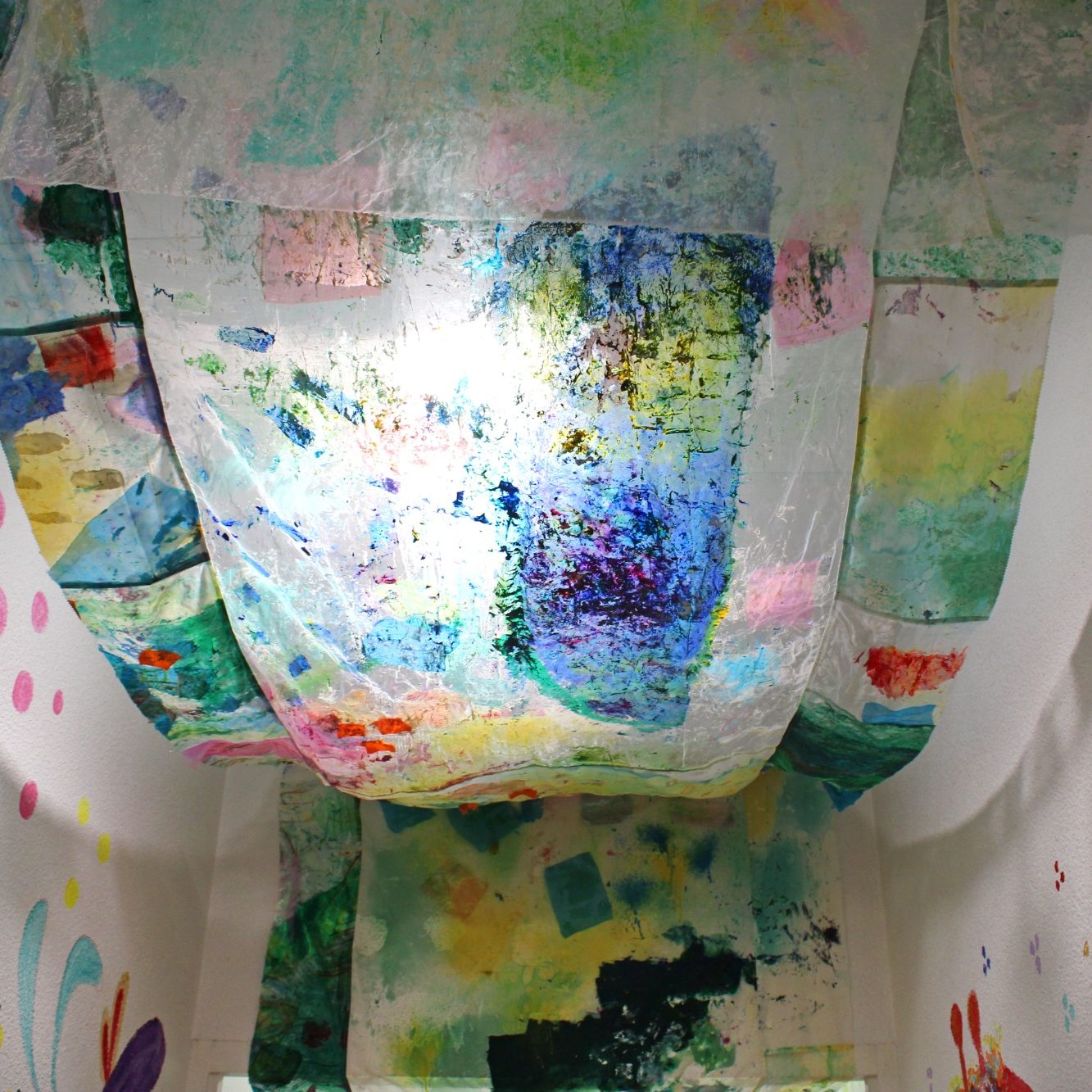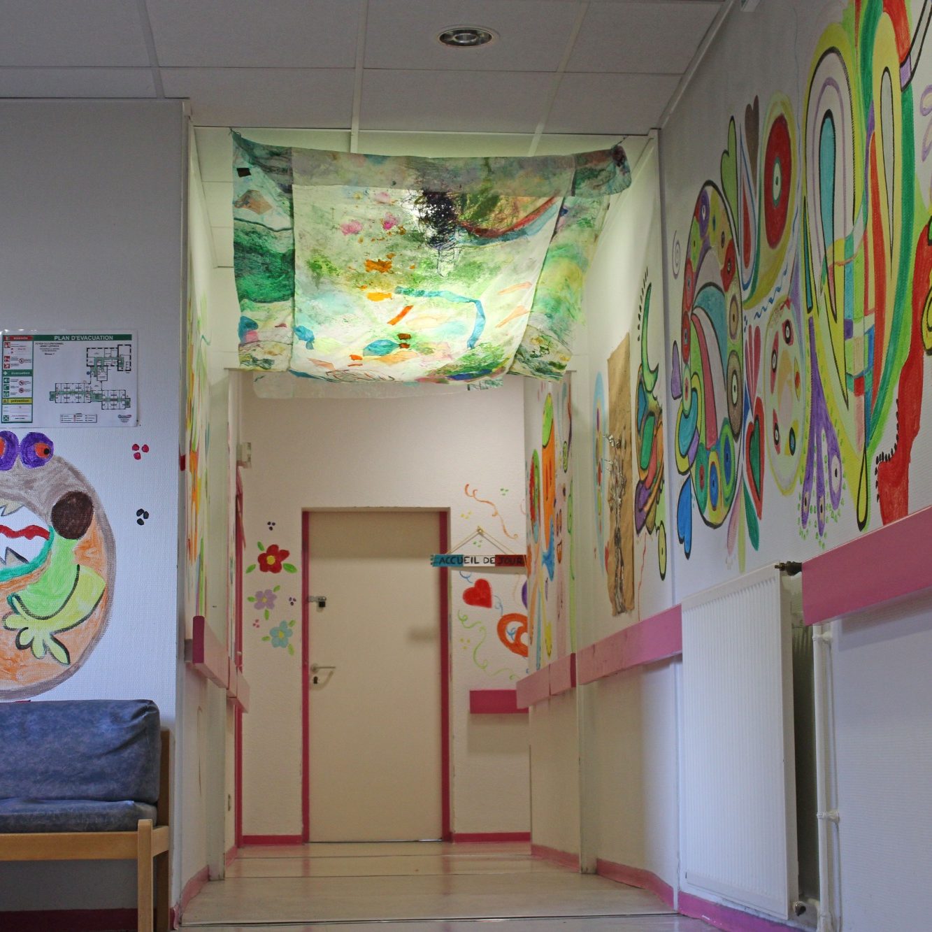 Environ 40 mètres carrés de tissus cousus ensemble dans trois endroits du Foyer occupationnel Jenny Lepreux, colle, peinture acrylique, encres, pastels, morceaux de tissus et feutres acryliques. Decembre 2025