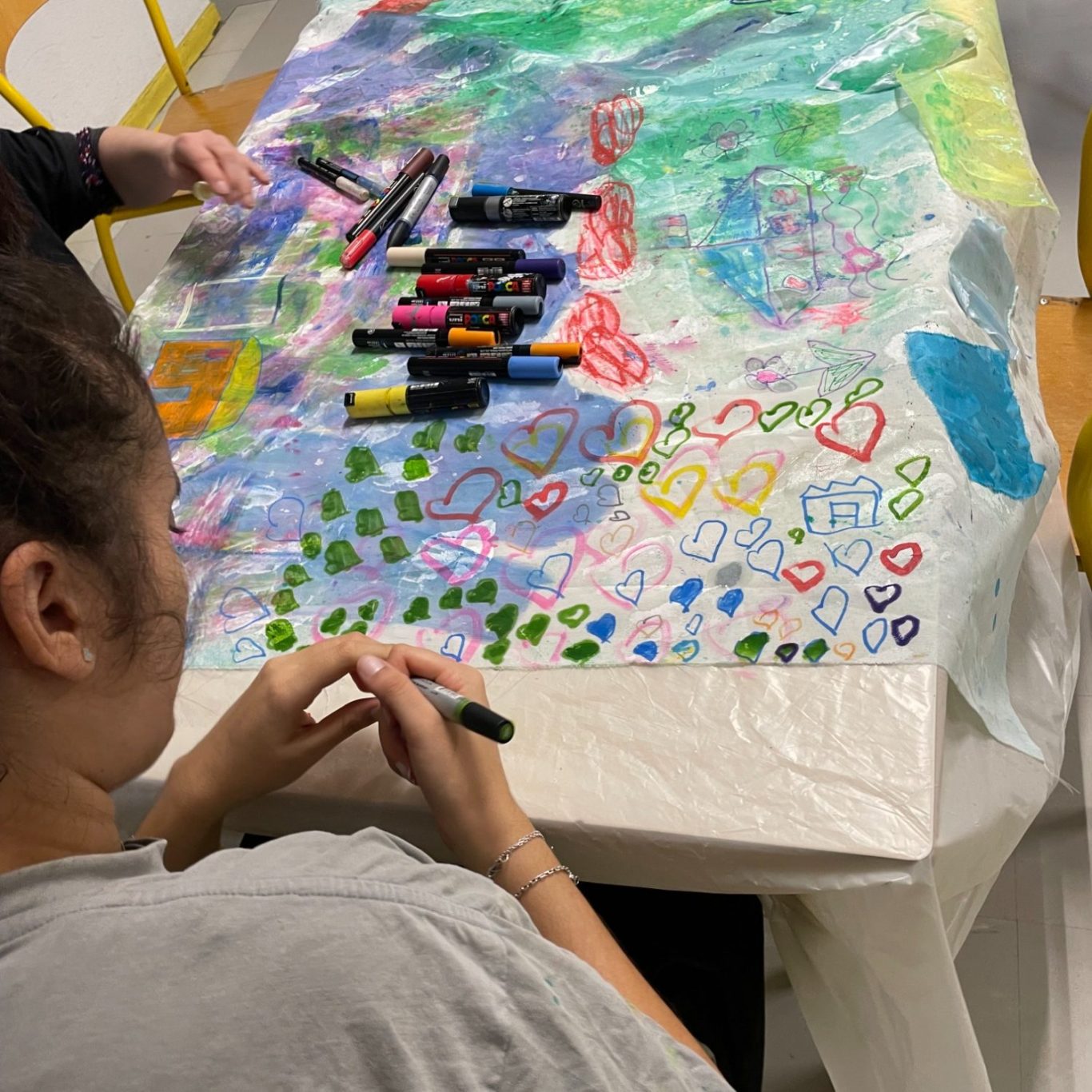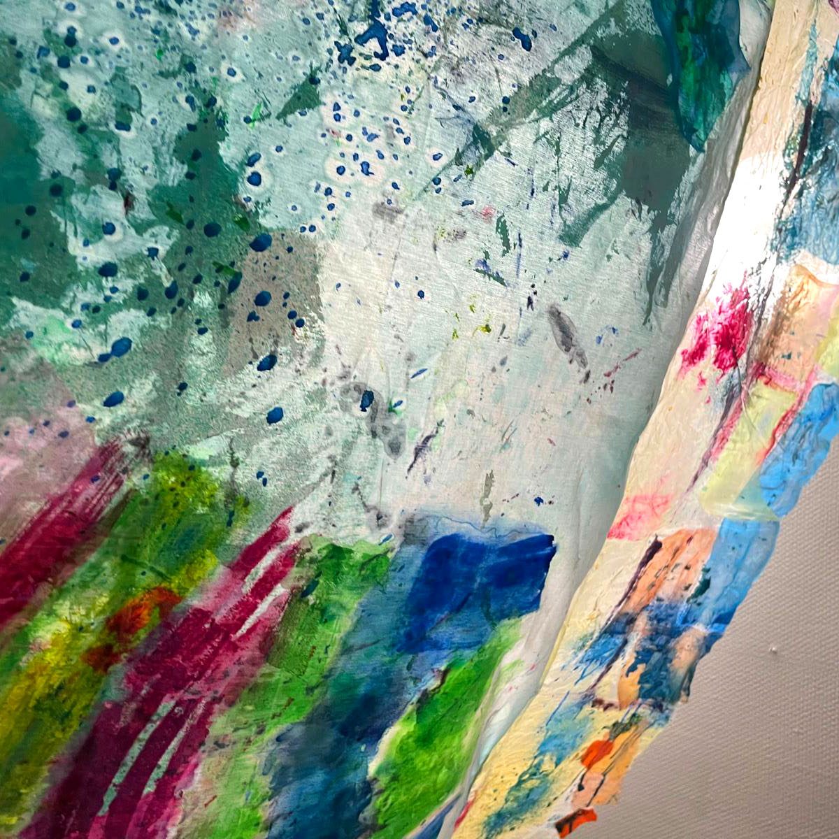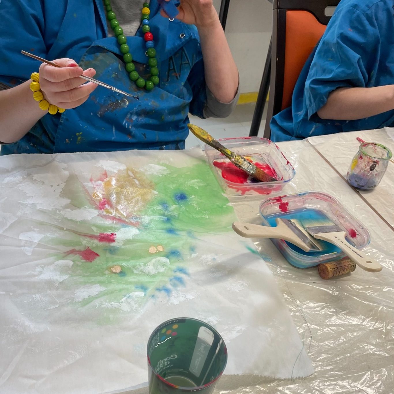 Environ 40 mètres carrés de tissus cousus ensemble dans trois endroits du Foyer occupationnel Jenny Lepreux, colle, peinture acrylique, encres, pastels, morceaux de tissus et feutres acryliques. Decembre 2025