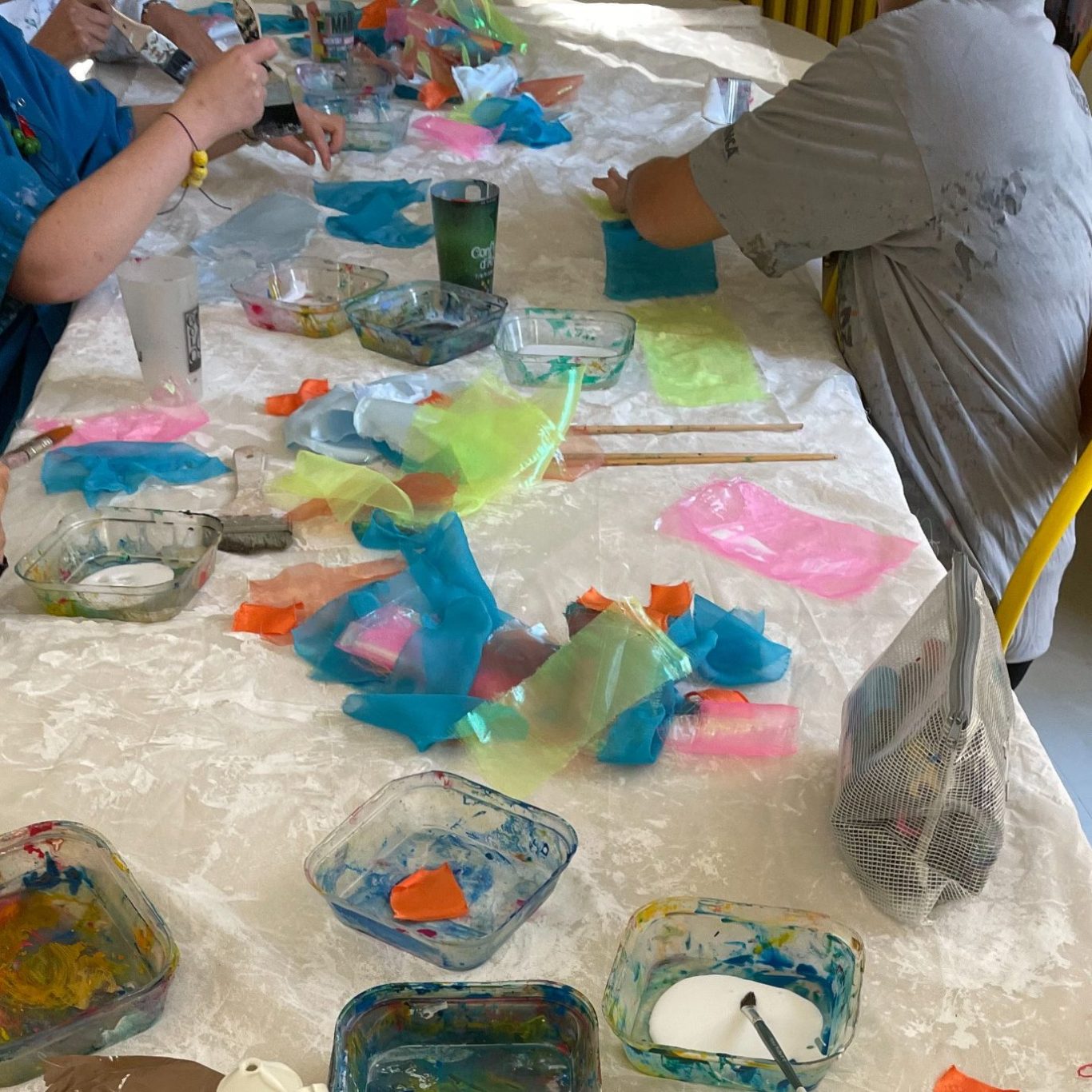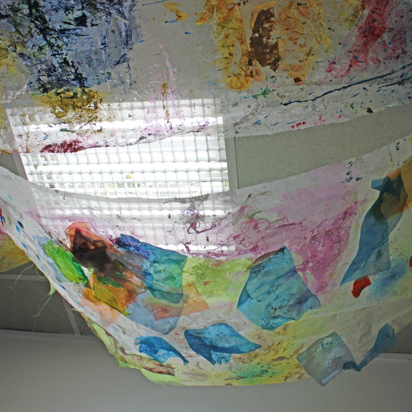 Le 3 décembre, ce plafond de tissus colorés prend place au sein du foyer occupationnel Jenny Lepreux à Mérignac pour célébrer la journée du handicap. Il est réalisé par 9 résidents du foyer lors de 10 séances.