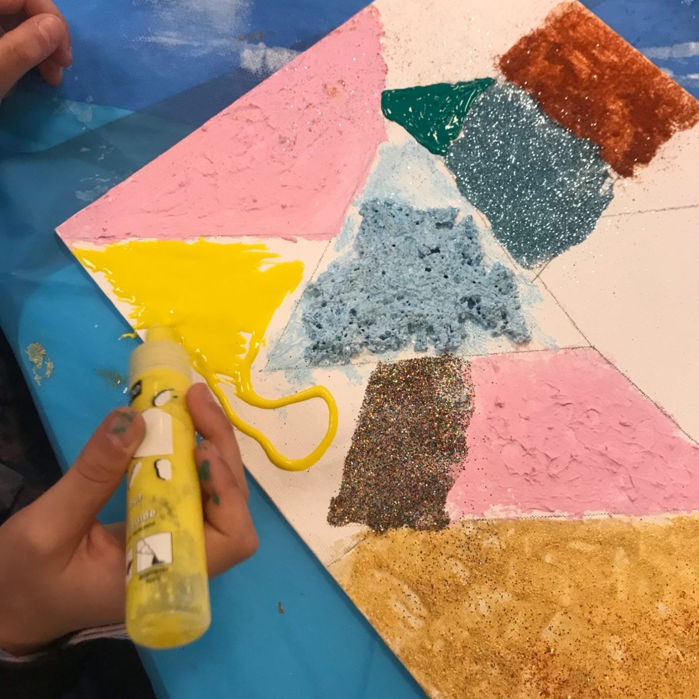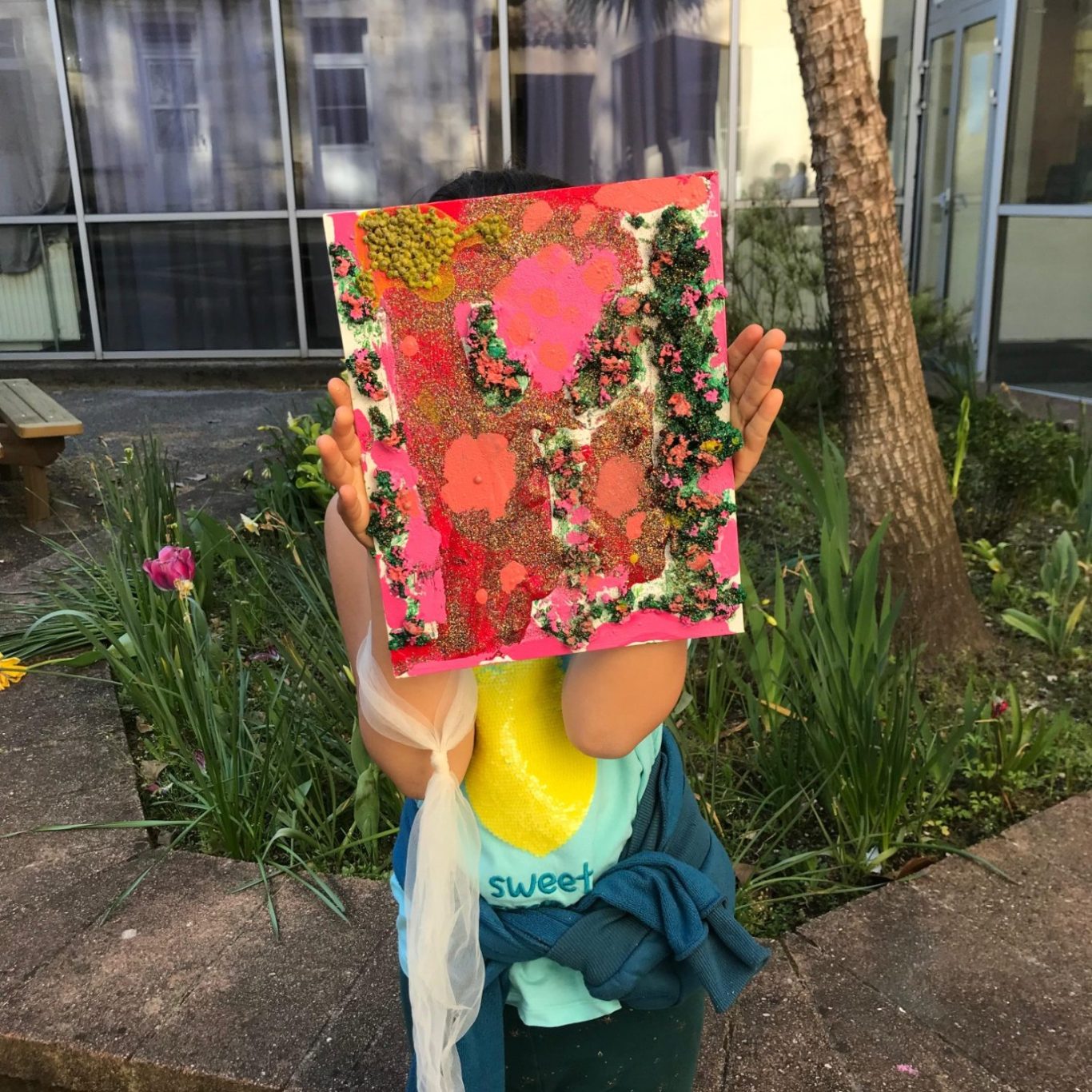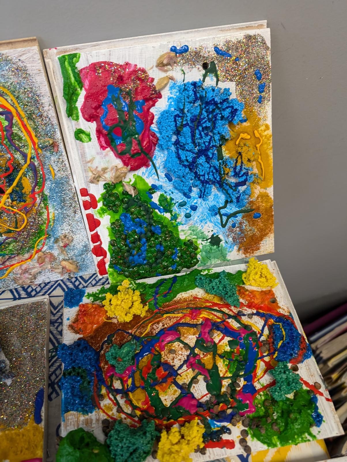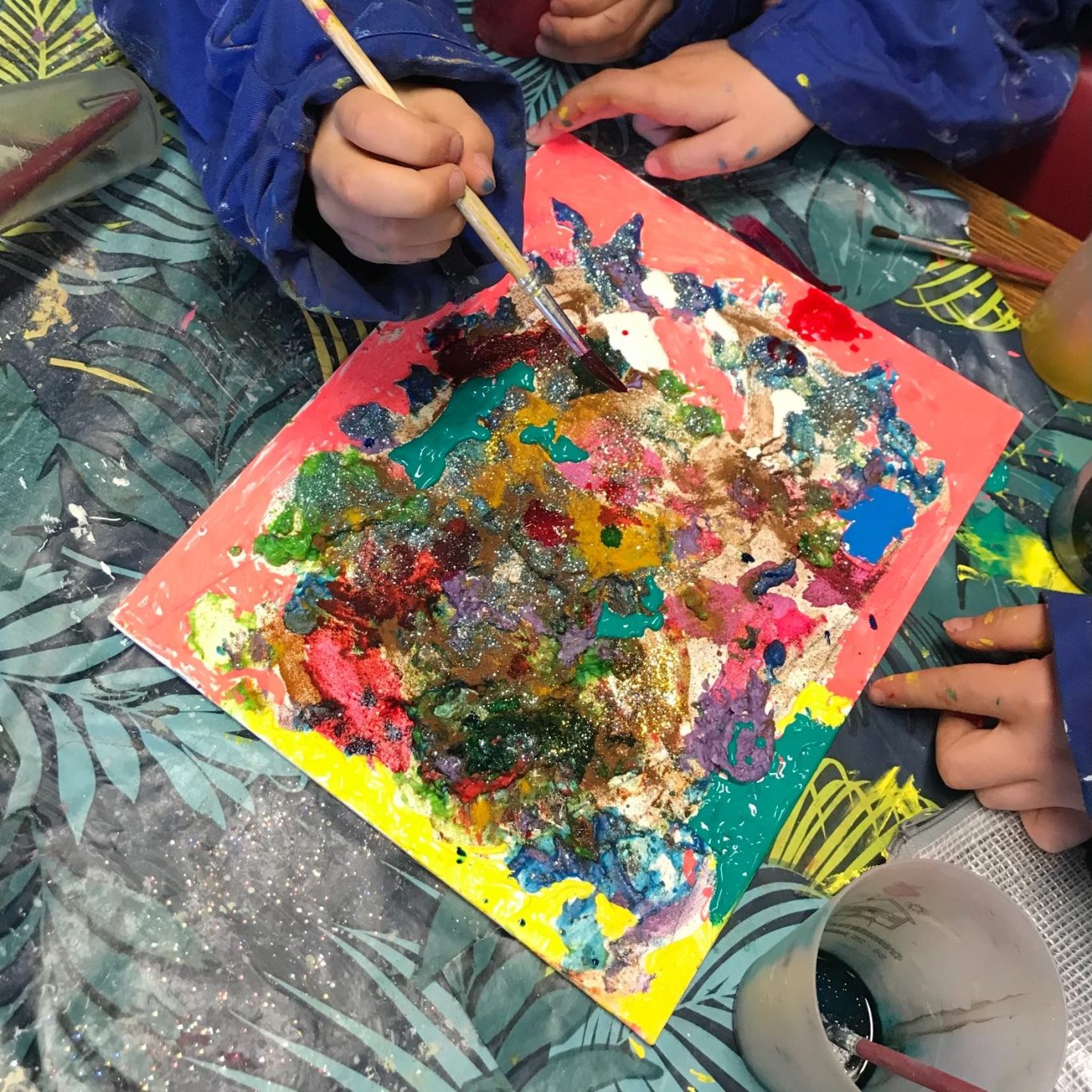 Les participants sont invités à créer leur propre langage en peinture. Ils élaborent à partir d’un buffet de matières, leur pâte colorée (épices, farine, semoule, lentilles, paillettes, sable, encre, peinture, etc.).