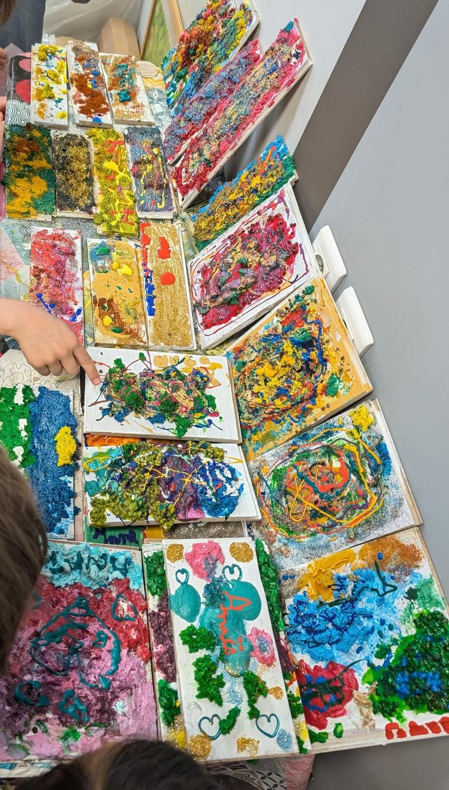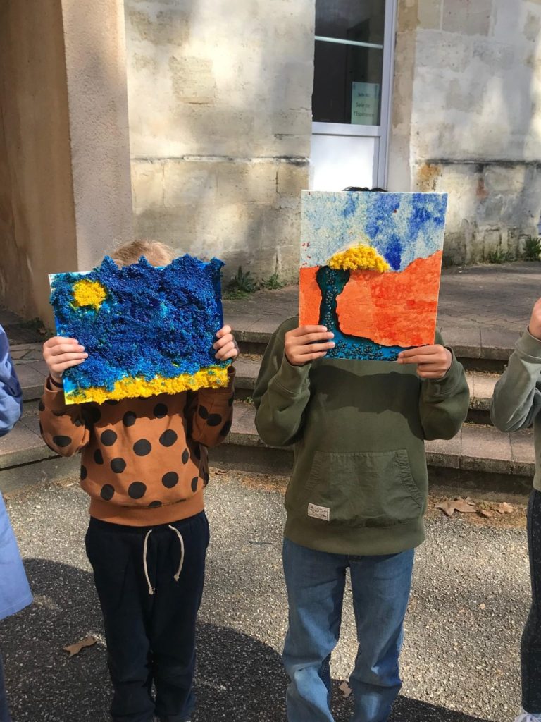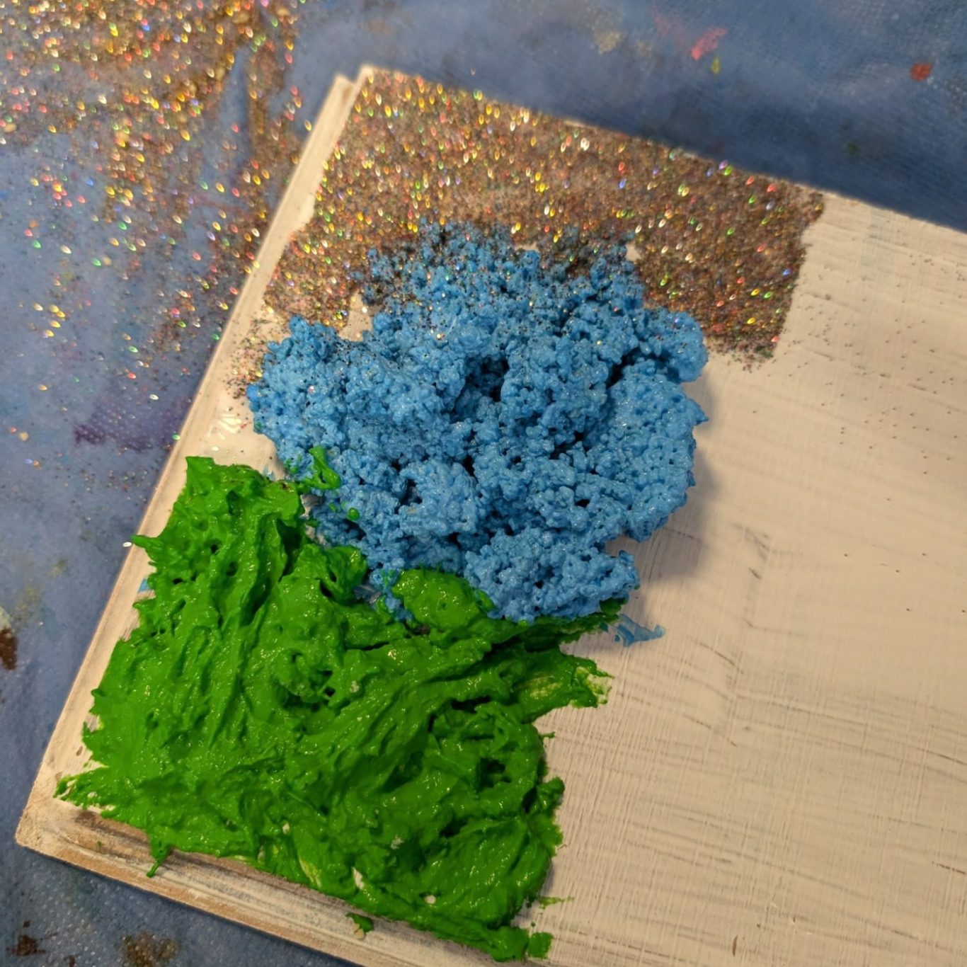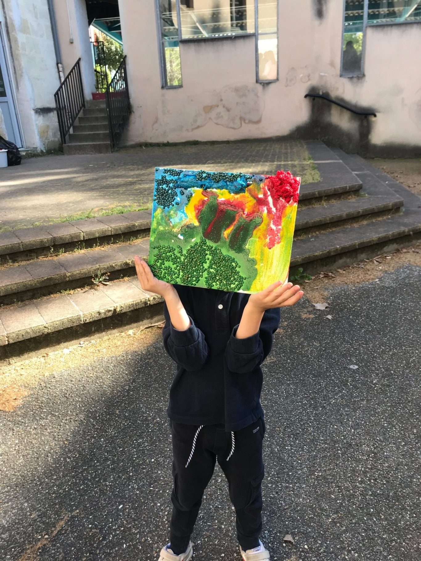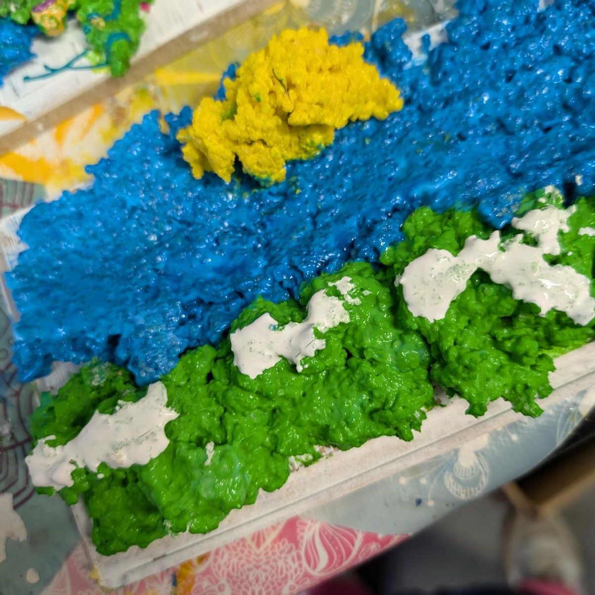 Les participants sont invités à créer leur propre langage en peinture. Ils élaborent à partir d’un buffet de matières, leur pâte colorée (épices, farine, semoule, lentilles, paillettes, sable, encre, peinture, etc.).